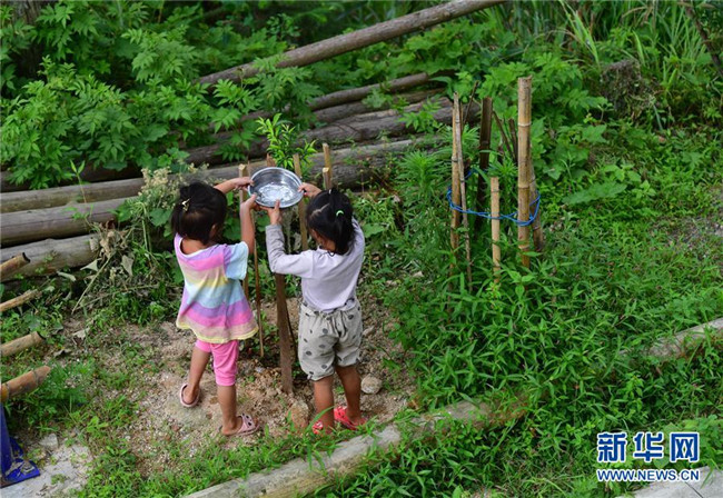 在烏英苗寨,小朋友給樹苗澆水(6月20日攝)。 新華社記者 黃孝邦 攝