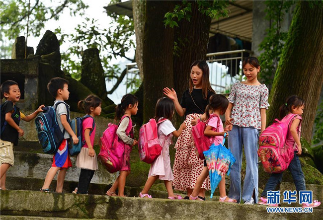 在烏英苗寨教學點,桿洞鄉(xiāng)中心校老師韋春蘭(后排左)和孩子們告別(7月1日攝)。桿洞鄉(xiāng)中心校近期開展送教到烏英活動,定期到教學點開展送教工作。 新華社記者 黃孝邦 攝