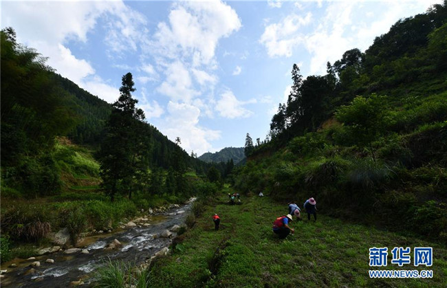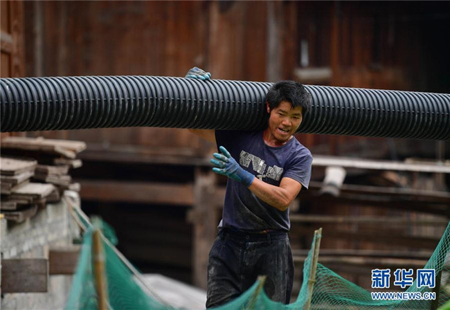 在烏英苗寨,村民在搬運排污管道,準備鋪設(shè)(7月7日攝)。 新華社記者 黃孝邦 攝