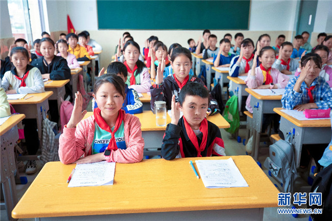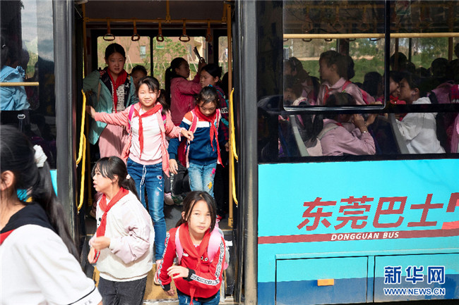 如今,李本艷姐弟倆從卯家灣家門口坐上東莞愛心巴士,25分鐘就可到學(xué)校(攝于7月3日)。新華網(wǎng)發(fā)(鮑禹 攝)