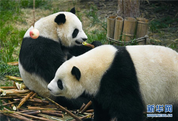 8月16日,大熊貓“奇果”(左)和“園滿”在西寧熊貓館內(nèi)玩耍。青海省西寧熊貓館的四只大熊貓已經(jīng)在西寧生活了一年多,在工作人員的悉心照顧下,已經(jīng)適應(yīng)了青藏高原的氣候,身體各項(xiàng)指標(biāo)正常。新華社記者薛玉斌攝