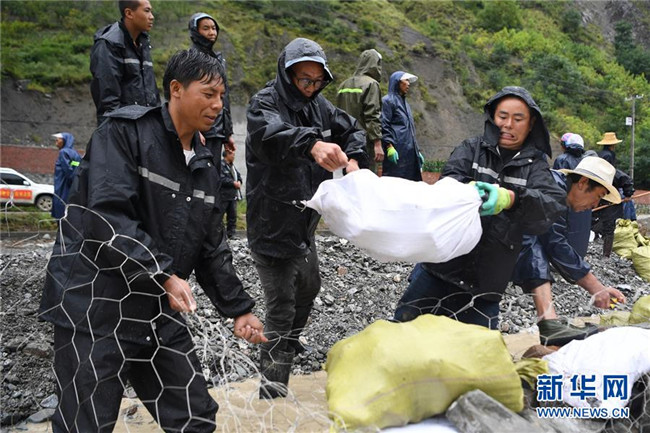 8月23日,舟曲縣曲告納鎮(zhèn)拉莫蓋托村村民在鐵壩河沿岸水毀的道路上搶險自救。 新華社記者 陳斌 攝