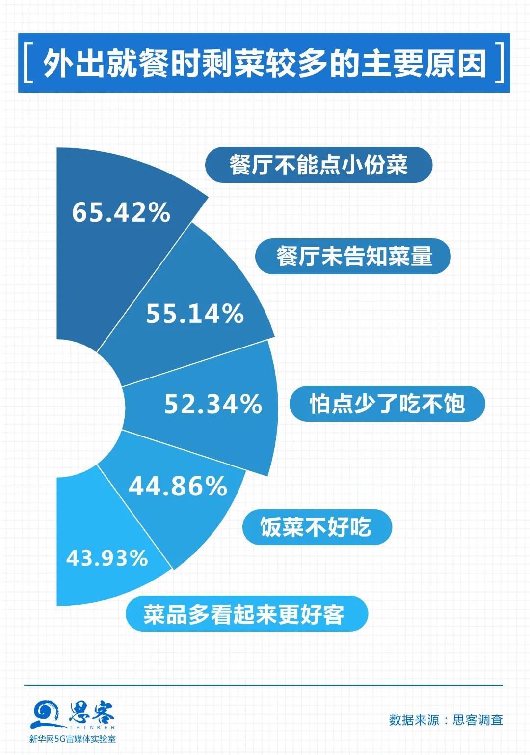 餐廳不能點(diǎn)小份菜、餐廳未明確標(biāo)明菜量、怕點(diǎn)少了吃不飽是受訪者認(rèn)為剩菜較多的主要原因,分別占65.42%、55.14%和52.34%。