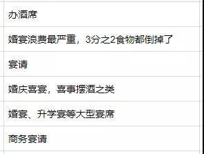 在調(diào)查問卷的后臺留言中,不少受訪者留言說,同學(xué)會、紅白宴、生日宴、升學(xué)宴、商務(wù)宴請等浪費(fèi)量較高,甚至有人說“三分之二的食物都倒掉了”。