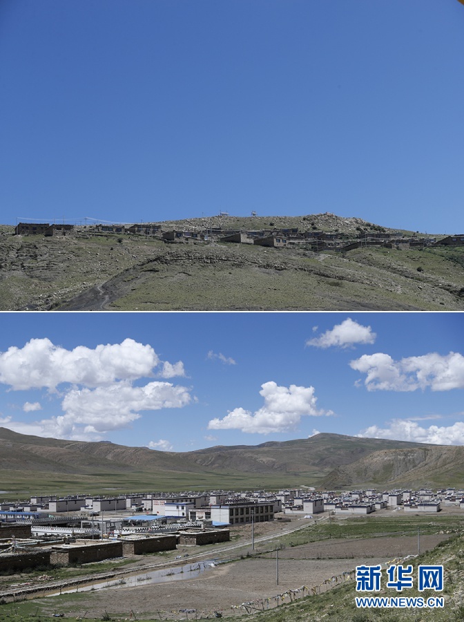 拼版照片:上圖是扎雜村山上的老房子;下圖是在山下建成的扎雜新村。新華網(wǎng)記者焦鵬 攝