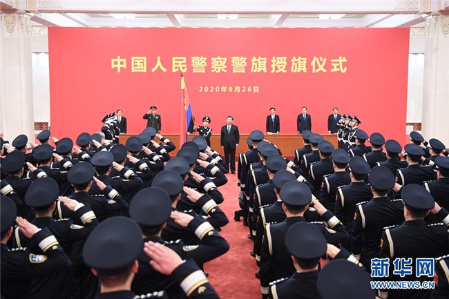 8月26日,中國人民警察警旗授旗儀式在人民大會堂舉行。中共中央總書記、國家主席、中央軍委主席習(xí)近平向中國人民警察隊(duì)伍授旗并致訓(xùn)詞。這是習(xí)近平向中國人民警察隊(duì)伍授旗。 新華社記者 鞠鵬 攝