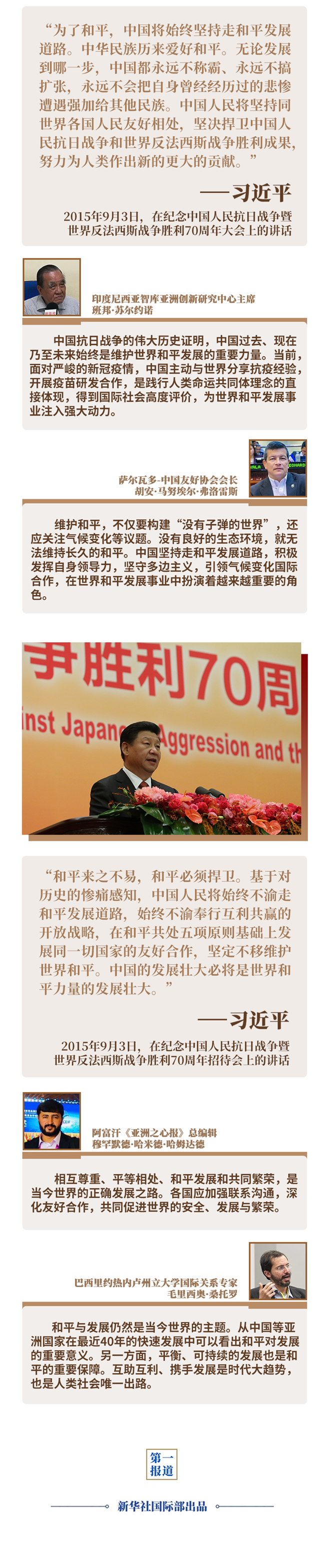 當今世界仍不太平,新冠疫情推動百年變局加速變化,進入動蕩變革期的世界亟需明確前行方向。此時,重溫5年前習近平主席紀念中國人民抗日戰(zhàn)爭暨世界反法西斯戰(zhàn)爭勝利70周年重要講話中關(guān)于和平發(fā)展的重要論述,尤其具有現(xiàn)實意義——