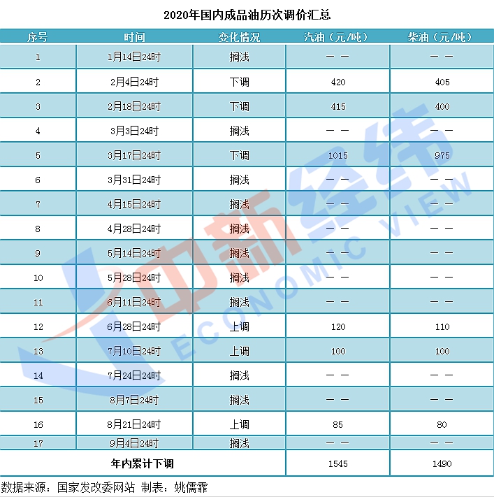 據中新經緯客戶端統(tǒng)計,2020年以來國內成品油調價已進行了十七輪,具體為上調三次、下調三次,擱淺十一次,汽油總計下調了1545元/噸,柴油總計下調了1490元/噸。其中,3月31日至6月11日的6輪調整均因國際市場原油價格低于40美元/桶而擱淺。如果本輪成品油調價下調,2020年國內成品油調價將呈現“三漲四跌十一擱淺”的格局。