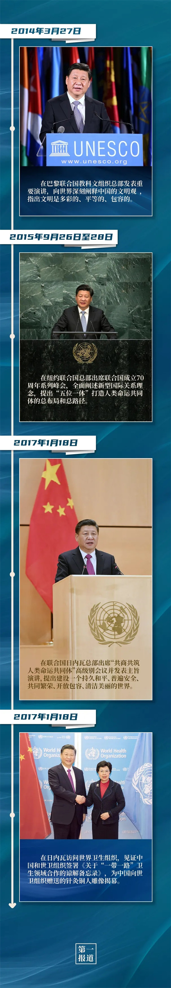 紐約聯(lián)合國總部、聯(lián)合國日內瓦總部、聯(lián)合國教科文組織總部、世界衛(wèi)生組織,這些地方都留下了習主席的訪問足跡。站在聯(lián)合國講臺,習主席闡述關于促進世界和平發(fā)展的重要主張,表達對聯(lián)合國事業(yè)的堅定支持,傳遞攜手各方應對全球挑戰(zhàn)、深化多邊合作的真誠意愿。