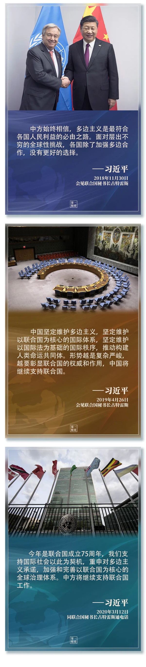 習主席指出,“支持聯(lián)合國發(fā)揮作用,維護聯(lián)合國權威和地位,是中國外交一項基本政策。”2013年以來,習主席多次會見聯(lián)合國主要官員,訪問聯(lián)合國總部及聯(lián)合國專門機構,出席一系列聯(lián)合國活動……親自推動中國同聯(lián)合國的合作,發(fā)出支持聯(lián)合國事業(yè)、捍衛(wèi)多邊主義的中國強音。