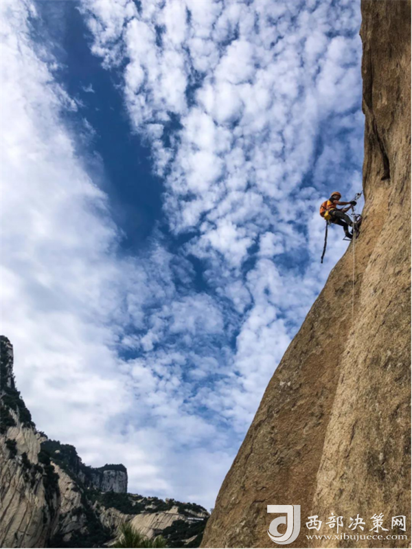 自然巖壁結(jié)組攀登源自軍事特戰(zhàn)項(xiàng)目,它就像是巖壁上的“馬拉松”,攀登大巖壁路線,攀巖隊(duì)伍需要使用吊帳和拖包等更多安全裝備完成多日攀登。從最基礎(chǔ)的攀登動(dòng)作練習(xí),到完成近千米的大巖壁攀登,這不僅將考驗(yàn)運(yùn)動(dòng)員們的攀巖技術(shù),還要挑戰(zhàn)他們?cè)趲r壁上的生存能力。此次自然巖壁結(jié)組攀登的巖壁甄選白云峰,其位于華山北峰云臺(tái)峰之北,石白如雪,一年四季白云繚繞,隨云飄浮而升降起伏,如海中的大魚隨浪翻滾,極其壯觀,而攀巖隊(duì)員們此次就需要在這600多米高的巖壁線路上生活至少2天。