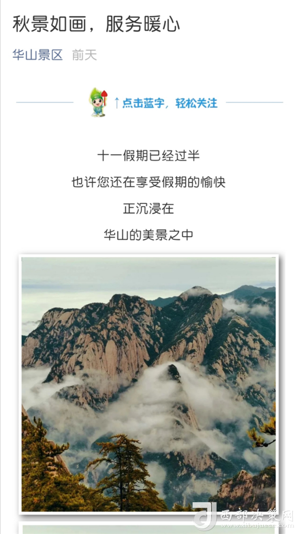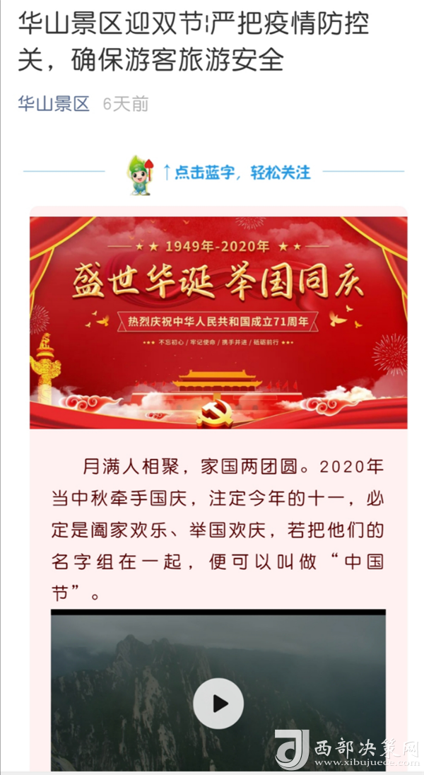 9月30日至10月8日期間,景區(qū)官方微信以歡度雙節(jié)、防疫安全、熱心服務(wù)、旅游攻略等為主題發(fā)布宣傳軟文23篇,累計閱讀量4.2萬人次,分享及轉(zhuǎn)發(fā)量共計1430次;官方微博向游客及時發(fā)布景區(qū)天氣、客流、景色實況、溫馨提示等景區(qū)度節(jié)綜合信息共計102條,閱讀量高達(dá)101.9萬次,并耐心、細(xì)致解答網(wǎng)友私信、評論共計532條;通過抖音平臺發(fā)布景區(qū)公告、秋日美景、好人好事等短視頻及圖片錦集共計18條,播放量共計 1.4萬次。