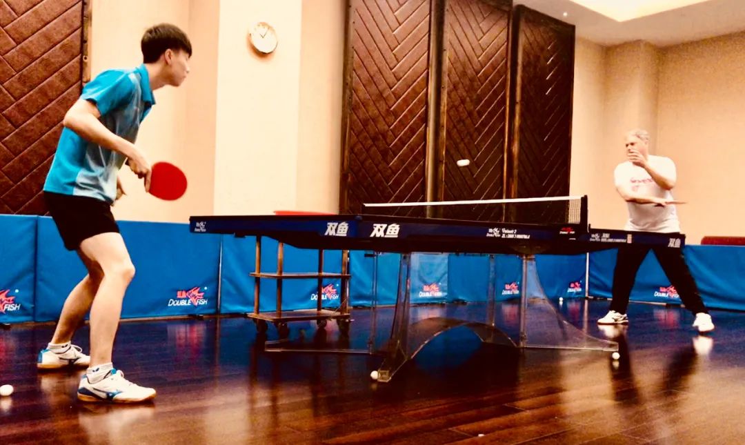 ▲ 資料圖片:喬希·塞利格(右)與中國乒乓球教練打球。圖由受訪者提供