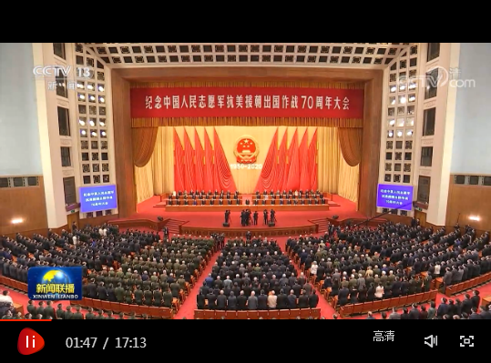 紀(jì)念中國人民志愿軍抗美援朝出國作戰(zhàn)70周年大會(huì)23日上午在北京人民大會(huì)堂隆重舉行。中共中央總書記、國家主席、中央軍委主席習(xí)近平在會(huì)上發(fā)表重要講話強(qiáng)調(diào),偉大的抗美援朝戰(zhàn)爭(zhēng),抵御了帝國主義侵略擴(kuò)張,捍衛(wèi)了新中國安全,保衛(wèi)了中國人民和平生活,穩(wěn)定了朝鮮半島局勢(shì),維護(hù)了亞洲和世界和平?;赝?0年前偉大的抗美援朝戰(zhàn)爭(zhēng),進(jìn)行具有許多新的歷史特點(diǎn)的偉大斗爭(zhēng),瞻望中華民族偉大復(fù)興的光明前景,我們無比堅(jiān)定、無比自信。我們要銘記抗美援朝戰(zhàn)爭(zhēng)的艱辛歷程和偉大勝利,弘揚(yáng)偉大抗美援朝精神,雄赳赳、氣昂昂,向著全面建設(shè)社會(huì)主義現(xiàn)代化國家新征程,向著實(shí)現(xiàn)中華民族偉大復(fù)興的中國夢(mèng)繼續(xù)奮勇前進(jìn)。