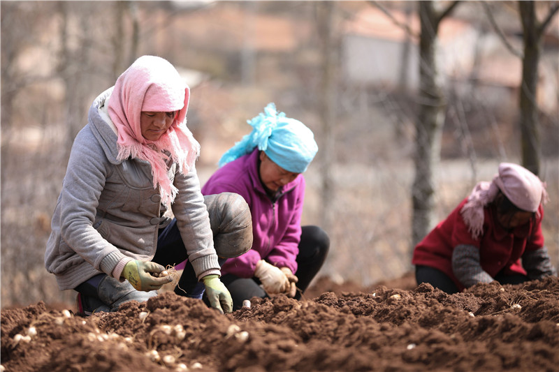 3月11日,甘肅省定西市渭源縣元古堆村村民在種植百合。新華社發(fā)(馬希平 攝)