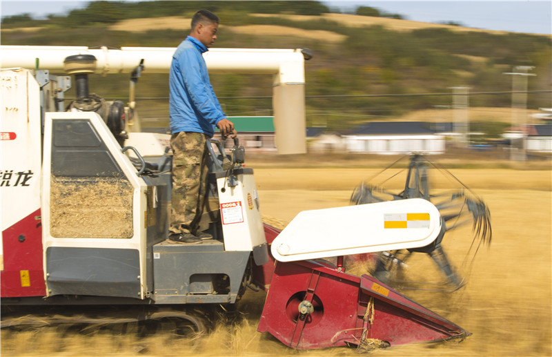 在吉林省延邊州和龍市光東村稻田里,農民駕駛收割機收獲成熟的水稻(2019年10月10日攝)。新華社記者 許暢 攝