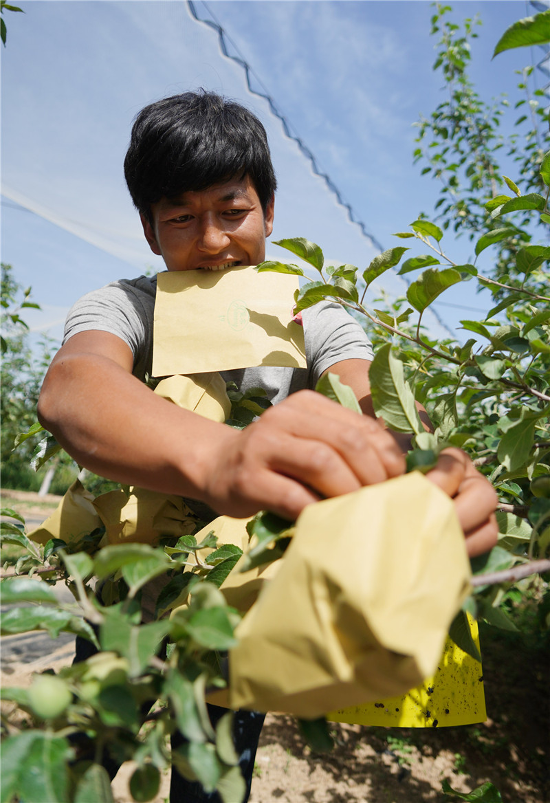 陜西省延安市梁家河村村民在給蘋果套袋(2018年5月24日攝)。新華社記者 邵瑞 攝