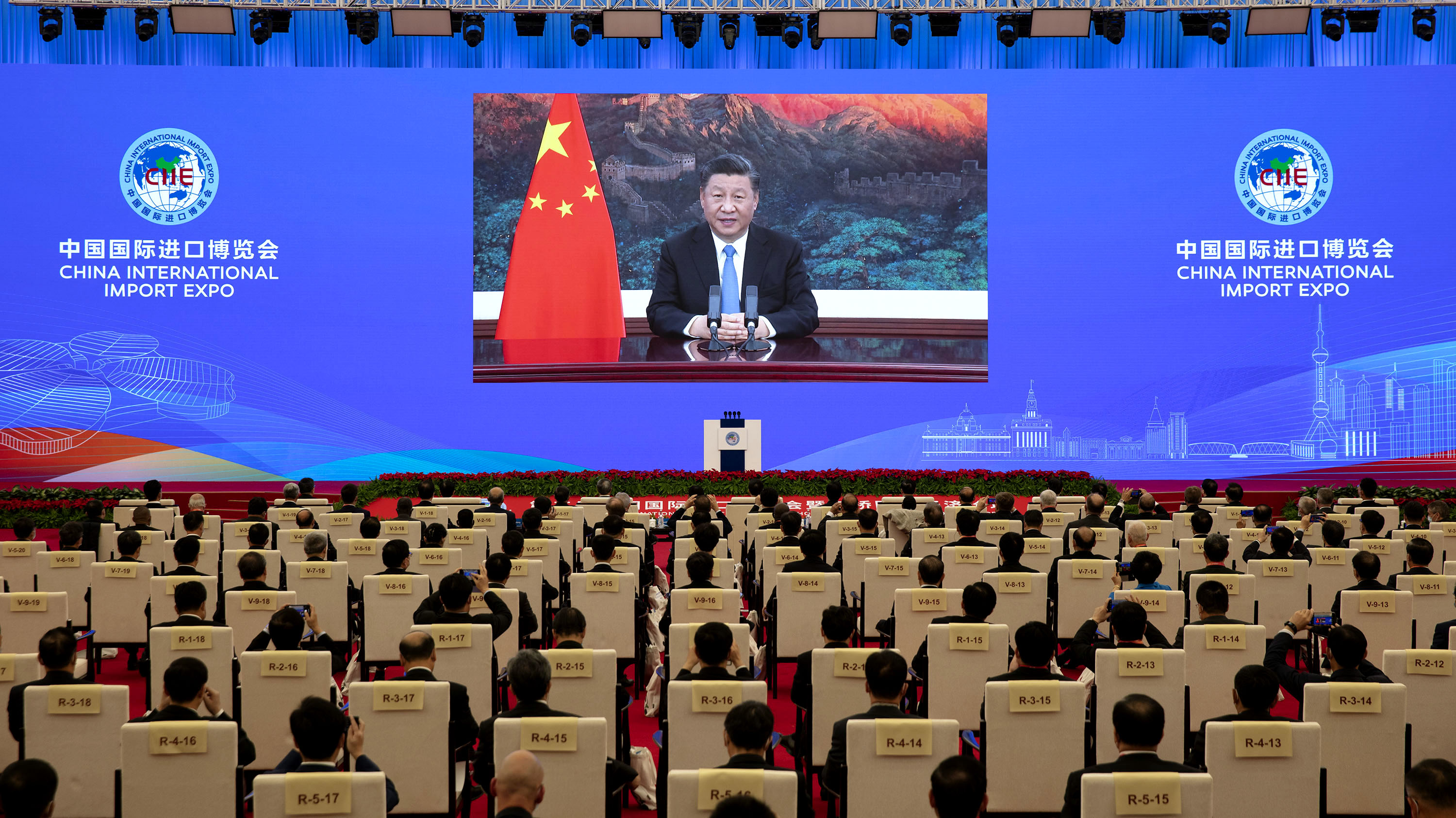 11月4日晚,習(xí)近平在第三屆中國(guó)國(guó)際進(jìn)口博覽會(huì)開(kāi)幕式上以視頻方式發(fā)表主旨演講。新華社記者 黃敬文 攝