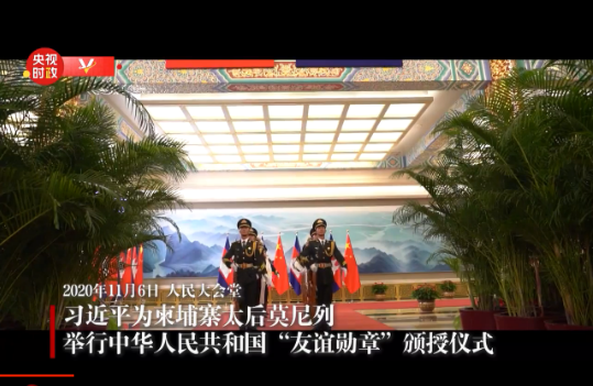 國家主席習(xí)近平6日在人民大會(huì)堂為柬埔寨太后莫尼列舉行中華人民共和國“友誼勛章”頒授儀式。