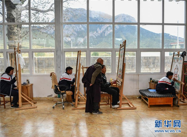 嘎瑪?shù)吕绽先嗽谖鞑夭际锌ㄈ魠^(qū)嘎瑪鄉(xiāng)的民族手工藝培訓(xùn)基地里教學(xué)員們畫唐卡(10月3日攝)。新華社記者 普布扎西 攝
