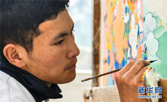 在西藏昌都市卡若區(qū)嘎瑪鄉(xiāng)的民族手工藝培訓(xùn)基地,學(xué)員在學(xué)習(xí)畫唐卡(10月3日攝)。新華社記者 晉美多吉 攝