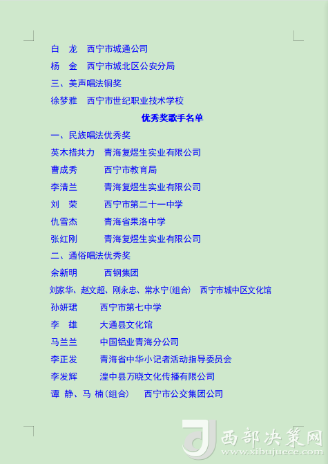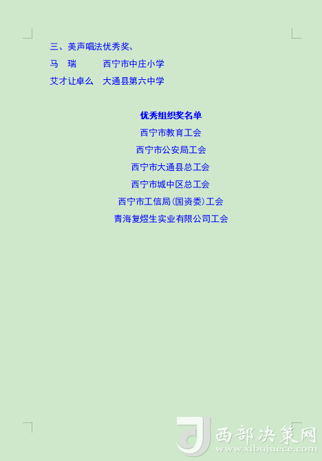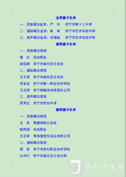 本次比賽旨在通過歌手們的激情演繹,增強全市廣大職工群眾的獲得感、幸福感、安全感,展現(xiàn)西寧市職工群眾的時代風(fēng)貌,進(jìn)一步營造弘揚勞模精神、勞動精神、工匠精神的濃厚氛圍,為更高水平打造綠色發(fā)展樣板城市建設(shè)新時代幸福西寧增強信心、凝聚力量。(后附獲獎名單)。