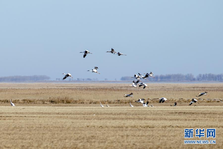 在內(nèi)蒙古扎賚特旗圖牧吉國(guó)家級(jí)自然保護(hù)區(qū)拍攝的白鶴(11月6日攝)?!⌒氯A社發(fā)(畢力格 攝)