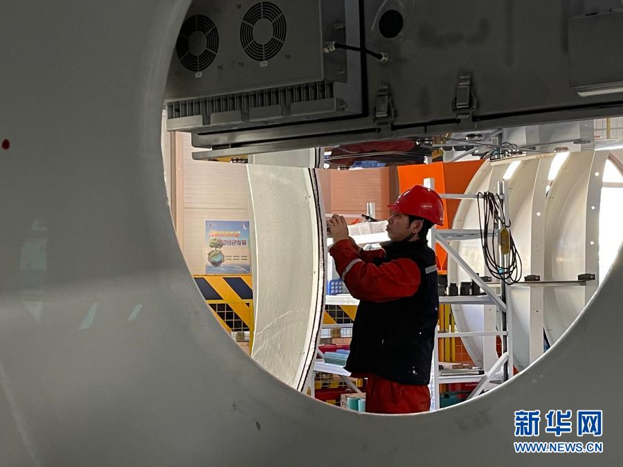11月26日,在金風(fēng)風(fēng)電設(shè)備科技有限公司生產(chǎn)車(chē)間,工人在加工風(fēng)機(jī)組件?!⌒氯A社記者 安路蒙 攝