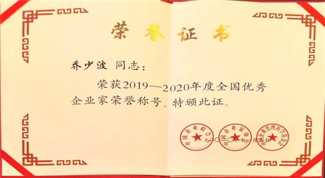 12月1日,以“弘揚(yáng)優(yōu)秀企業(yè)家精神,勇于創(chuàng)新?lián)?dāng)奉獻(xiàn)”為主題的“2020年全國企業(yè)家活動日暨中國企業(yè)家年會”在廣東省東莞市舉行。會上表彰了154名優(yōu)秀企業(yè)家,公司董事長、總經(jīng)理喬少波喜獲“2019-2020年全國優(yōu)秀企業(yè)家”稱號。