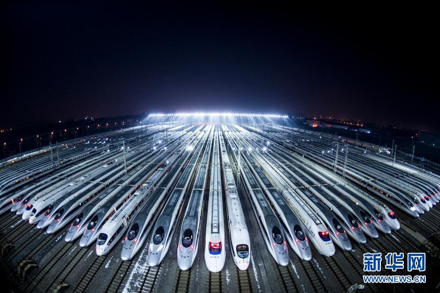 動車組??吭谖錆h動車段的存車線上,準備進行檢修和保溫作業(yè)(2018年2月1日攝)。新華社記者 肖藝九 攝