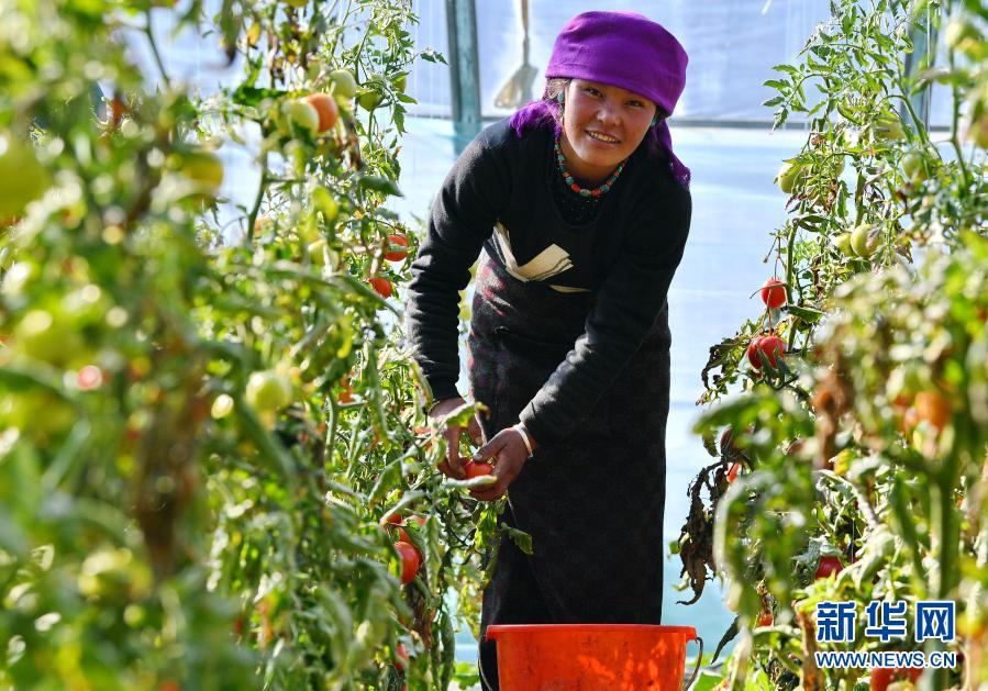 在西藏日喀則白朗國家級蔬菜標(biāo)準(zhǔn)化生產(chǎn)示范區(qū),白朗縣巴扎鄉(xiāng)查吾沖村村民次仁片多在蔬菜大棚里采摘西紅柿(3月2日攝)。新華社記者 張汝鋒 攝