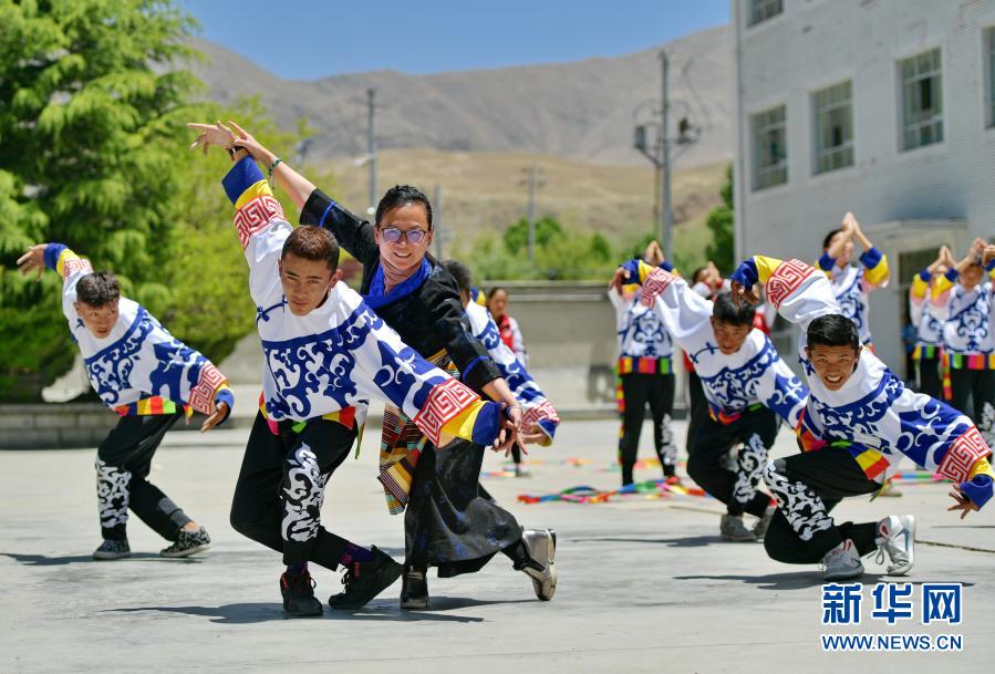在西藏山南市第一高級中學(xué),來自湖北省武漢市旅游學(xué)校的援藏教師馬丹(左三)指導(dǎo)學(xué)生練習(xí)校園啦啦操(2019年5月8日攝)。新華社記者 張汝鋒 攝