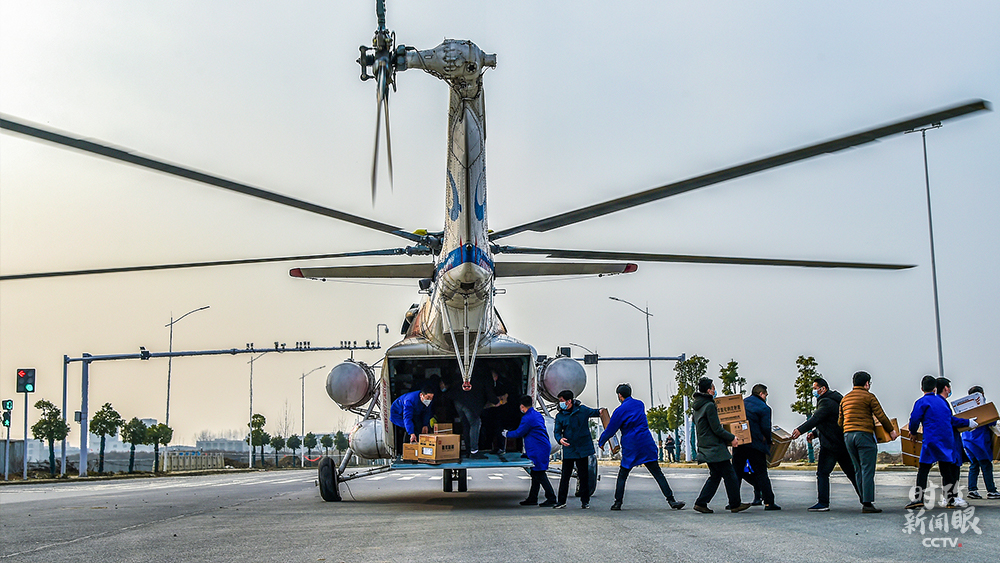 △2月3日,湖北襄陽工作人員正在從直升機(jī)上卸下防疫物資。