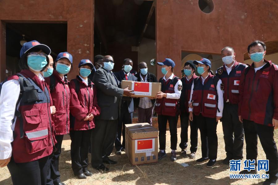 5月19日,在津巴布韋中馬紹納蘭省的姆武爾維醫(yī)院,中國抗疫醫(yī)療專家組為當(dāng)?shù)蒯t(yī)療機(jī)構(gòu)捐贈(zèng)醫(yī)療物資。新華社記者 張玉亮 攝
