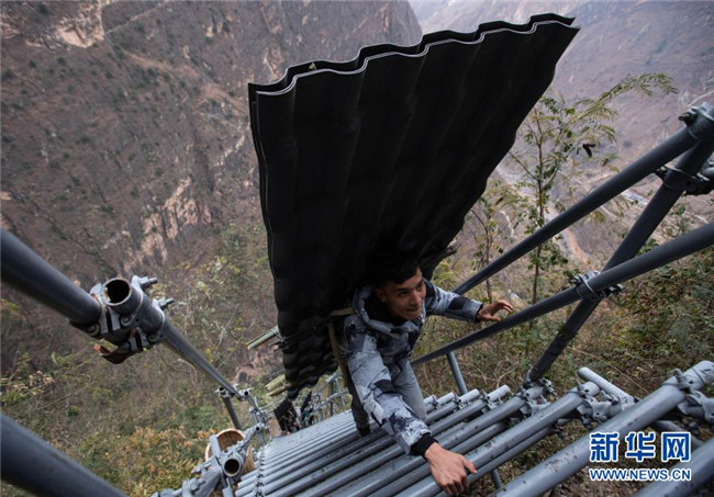 12月23日,某色蘇不惹(中)和同伴在鋼梯上休息,他們正通過鋼梯把修民宿的建材往村里背。新華社記者 江宏景 攝