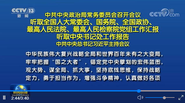 會議指出,黨中央權威和集中統(tǒng)一領導,是堅持黨的領導的最高原則,是我國制度優(yōu)勢的根本保證。黨中央每年聽取全國人大常委會、國務院、全國政協(xié)、最高人民法院、最高人民檢察院黨組工作匯報和中央書記處工作報告,是堅持黨中央權威和集中統(tǒng)一領導的一項重大制度性安排。
