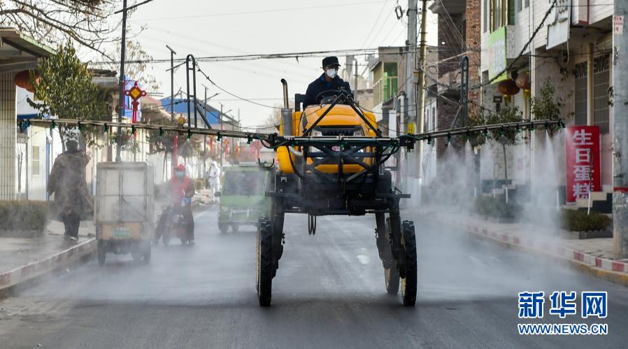 1月15日,在河北省石家莊市藁城區(qū)禪房村,防疫工作人員使用農用噴霧機進行消殺。新華社發(fā)(趙杰 攝)