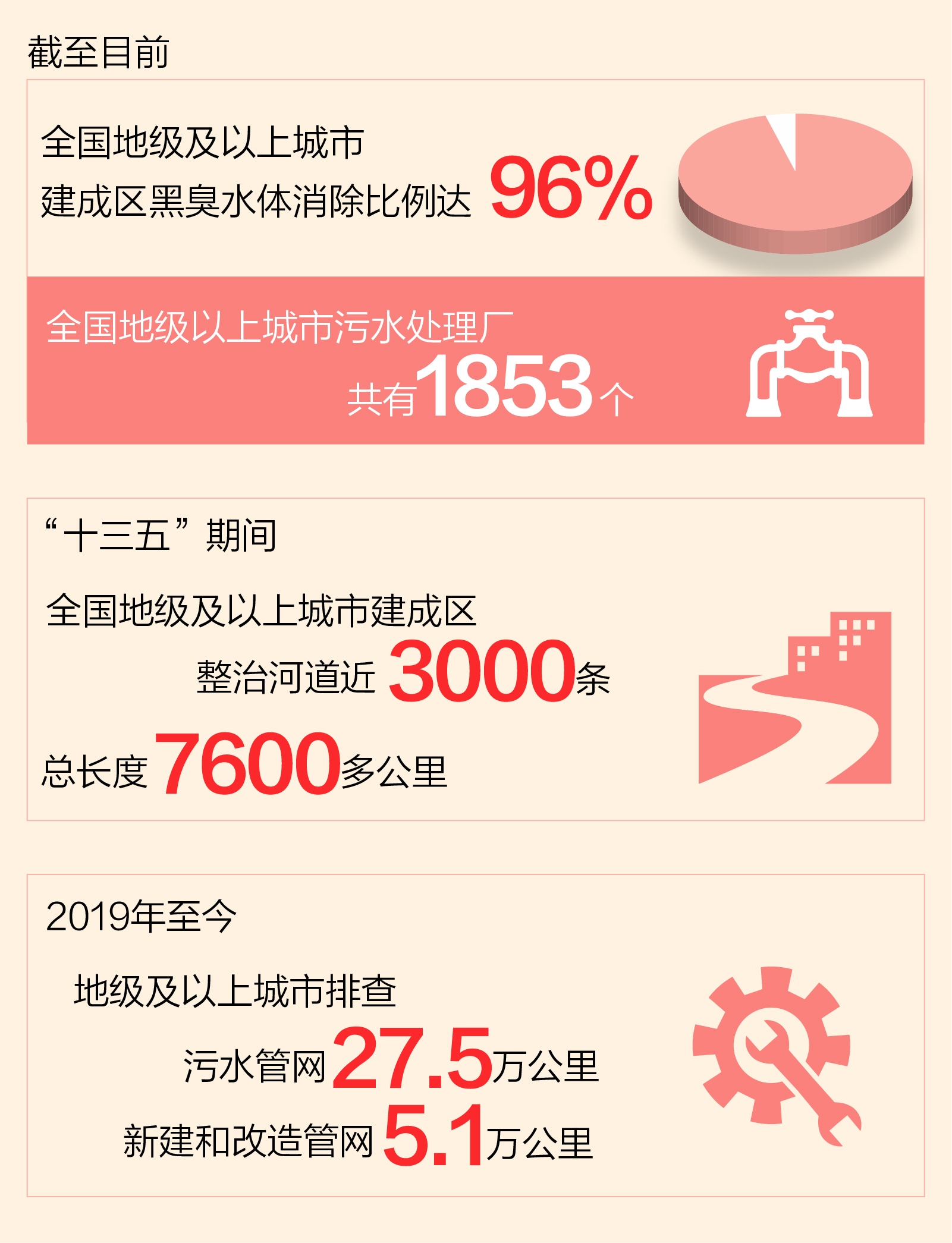 “十三五”期間,全國(guó)地級(jí)及以上城市建成區(qū)整治河道近3000條,總長(zhǎng)度7600多公里。截至目前,全國(guó)地級(jí)及以上城市建成區(qū)黑臭水體消除比例達(dá)96%。2019年至今,全國(guó)地級(jí)及以上城市排查污水管網(wǎng)27.5萬公里,新建和改造管網(wǎng)5.1萬公里。
