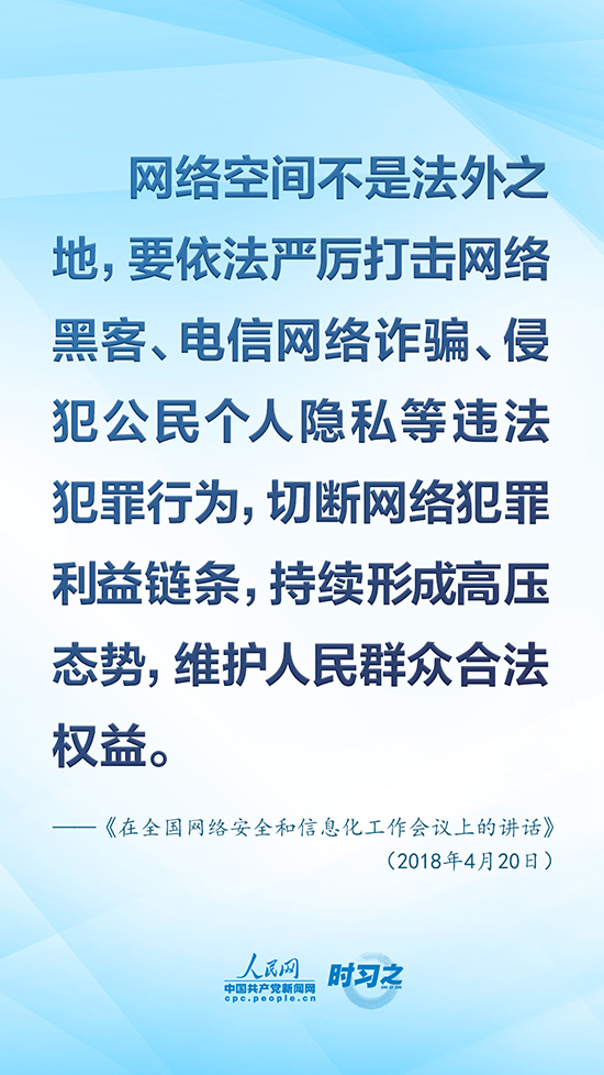 黨的十八大以來,以習近平同志為核心的黨中央從進行具有許多新的歷史特點的偉大斗爭出發(fā),重視互聯(lián)網(wǎng)、發(fā)展互聯(lián)網(wǎng)、治理互聯(lián)網(wǎng),統(tǒng)籌協(xié)調(diào)涉及政治、經(jīng)濟、文化、社會、軍事等領(lǐng)域網(wǎng)絡(luò)安全和信息化重大問題,作出一系列重大決策、實施一系列重大舉措,推動我國網(wǎng)信事業(yè)取得歷史性成就,走出一條中國特色治網(wǎng)之道。人民網(wǎng)·中國共產(chǎn)黨新聞網(wǎng)“時習之”欄目擷取了《習近平關(guān)于網(wǎng)絡(luò)強國論述摘編》中有關(guān)“維護國家網(wǎng)絡(luò)安全”的10句金句,以饗讀者。