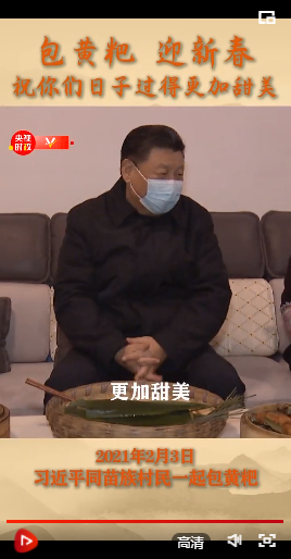 在苗族村民趙玉學(xué)家,習(xí)近平同一家人圍坐客廳,邊聊家常邊制作當(dāng)?shù)貍鹘y(tǒng)節(jié)日食品黃粑??倳浻H手用粽葉裹著糯米、黃豆面包好一個(gè)黃粑,微笑著說:“我包過大粽子,這么小的沒有。很好很好,(祝你們今后的)日子過得更加幸福、更加甜美!”