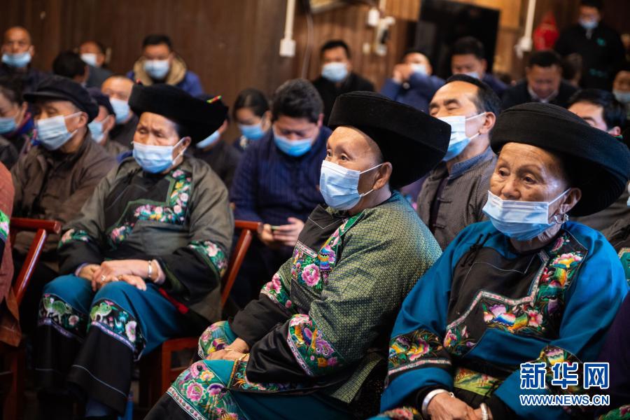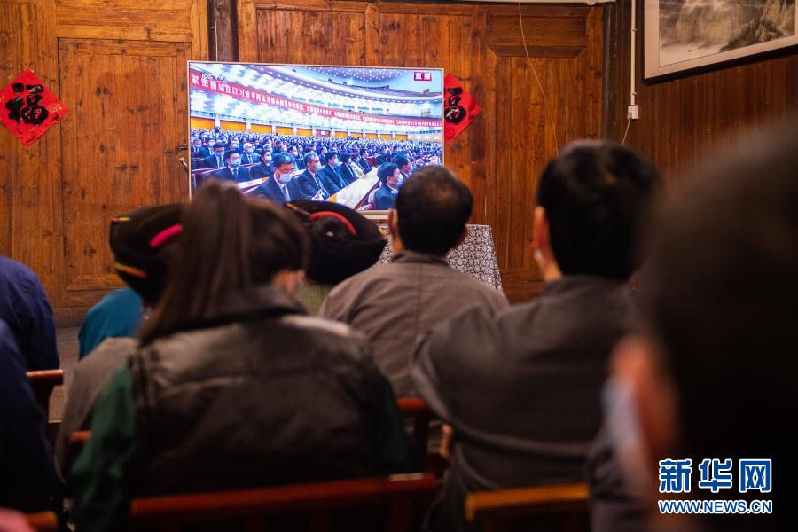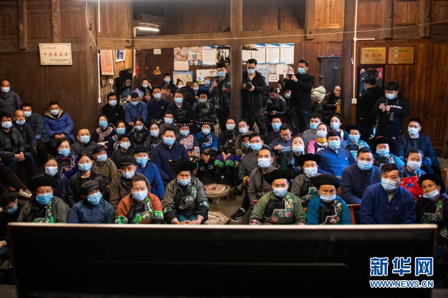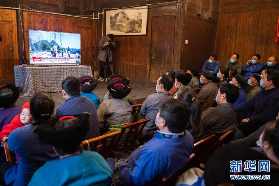 2月25日上午,在湖南省湘西土家族苗族自治州花垣縣十八洞村,當(dāng)?shù)馗刹?、群眾在一戶村民家收看全國脫貧攻?jiān)總結(jié)表彰大會直播。新華社記者 陳思汗 攝