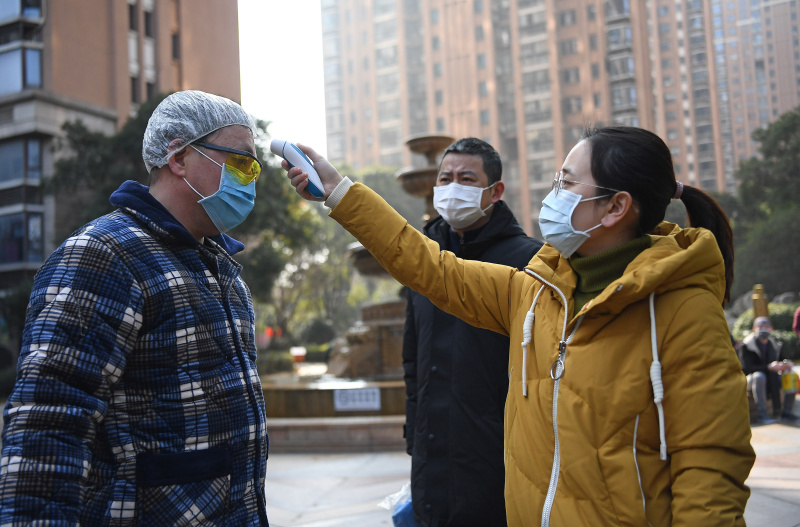 △2020年1月31日,在江西省南昌市西湖區(qū)一社區(qū)門口,一位青年街道干部(右一)為居民測(cè)量體溫。