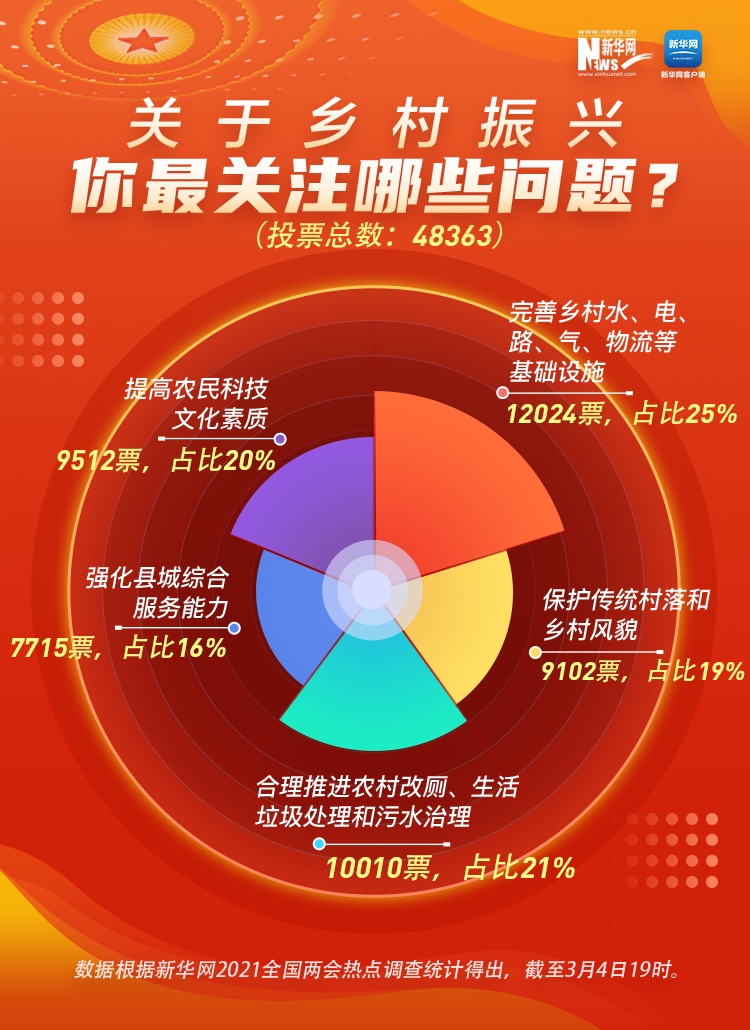 其中,“完善鄉(xiāng)村水、電、路、氣、物流等基礎(chǔ)設(shè)施”、“合理推進農(nóng)村改廁、生活垃圾處理和污水治理”、“提高農(nóng)民科技文化素質(zhì)”位列子選項前三位,成為大家關(guān)注的焦點。如何推進更多、更具體的鄉(xiāng)村振興支持政策,如何突破戶籍制度等領(lǐng)域改革,如何完善城鄉(xiāng)一體化發(fā)展的體制機制、推動農(nóng)業(yè)農(nóng)村現(xiàn)代化邁好“十四五”第一步,成為代表委員的重要關(guān)切。