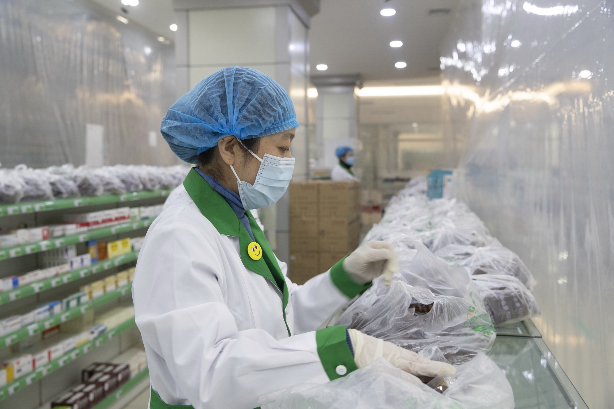 ↑2021年1月25日,在黑龍江綏化市泰華大藥房?jī)?nèi),工作人員打包中藥湯劑。為應(yīng)對(duì)新冠肺炎疫情,綏化市指定醫(yī)藥企業(yè)代煎中藥湯劑送往市內(nèi)各個(gè)集中隔離點(diǎn)。