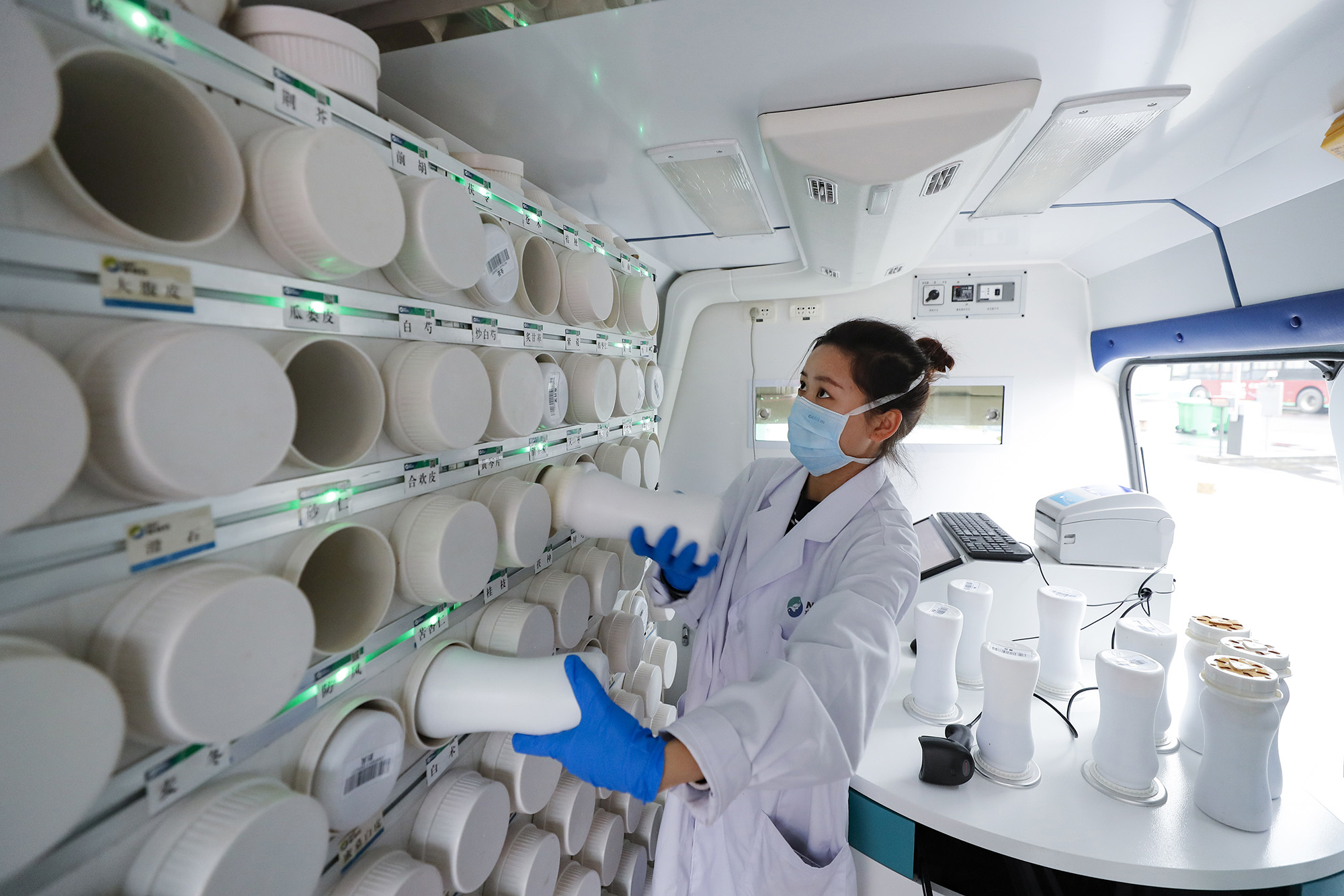 ↑2020年2月26日,在武漢江夏方艙醫(yī)院院內(nèi)的“流動(dòng)應(yīng)急智能中藥房”里,系統(tǒng)把藥方中包含的單味藥用綠燈標(biāo)識(shí)出來,工作人員將這些盛有單味中藥濃縮顆粒的藥瓶取下來準(zhǔn)備制藥。江夏方艙醫(yī)院是武漢首個(gè)以中醫(yī)院運(yùn)轉(zhuǎn)模式來進(jìn)行臨床治療、管理的方艙醫(yī)院。