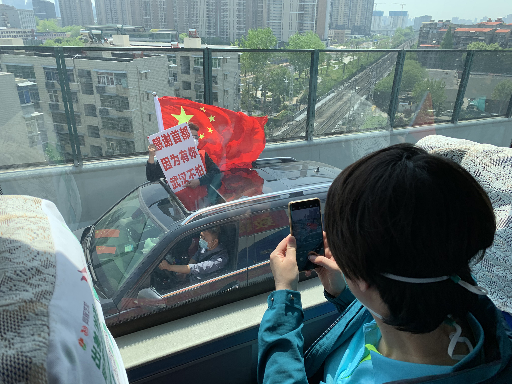 ↑2020年4月15日,武漢市民自發(fā)上街送別北京協(xié)和醫(yī)院國(guó)家援鄂抗疫醫(yī)療隊(duì)。