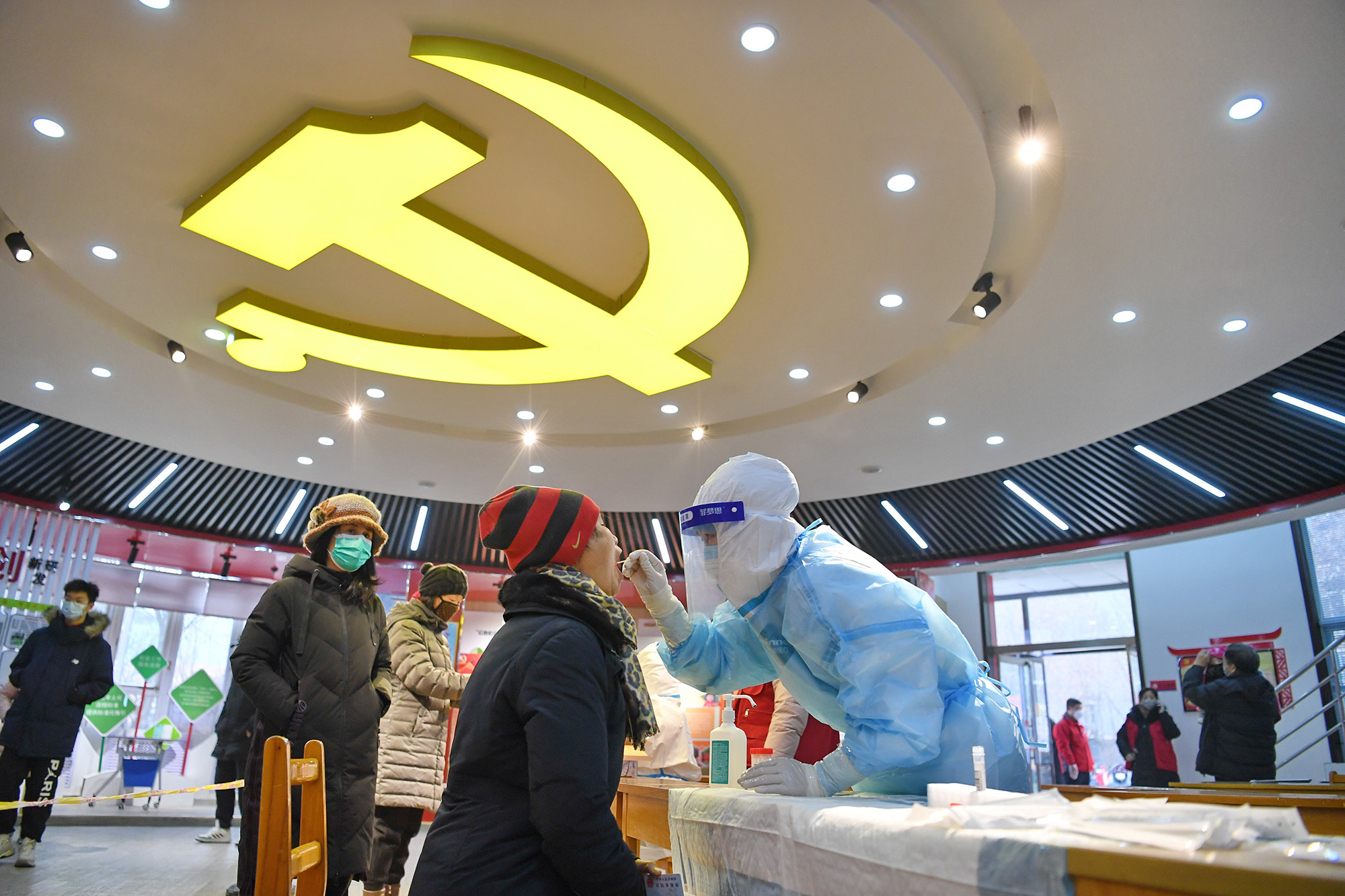 ↑2021年1月25日,醫(yī)護(hù)人員在石家莊市裕華區(qū)一小區(qū)為居民進(jìn)行核酸采樣。