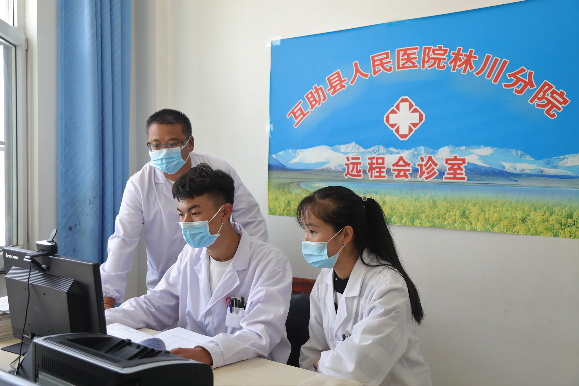 ↑在青海省海東市互助土族自治縣林川衛(wèi)生院遠(yuǎn)程會(huì)診室,醫(yī)生盛生凱(左二)和同事在連線互助縣人民醫(yī)院專家(2020年9月10日攝)。