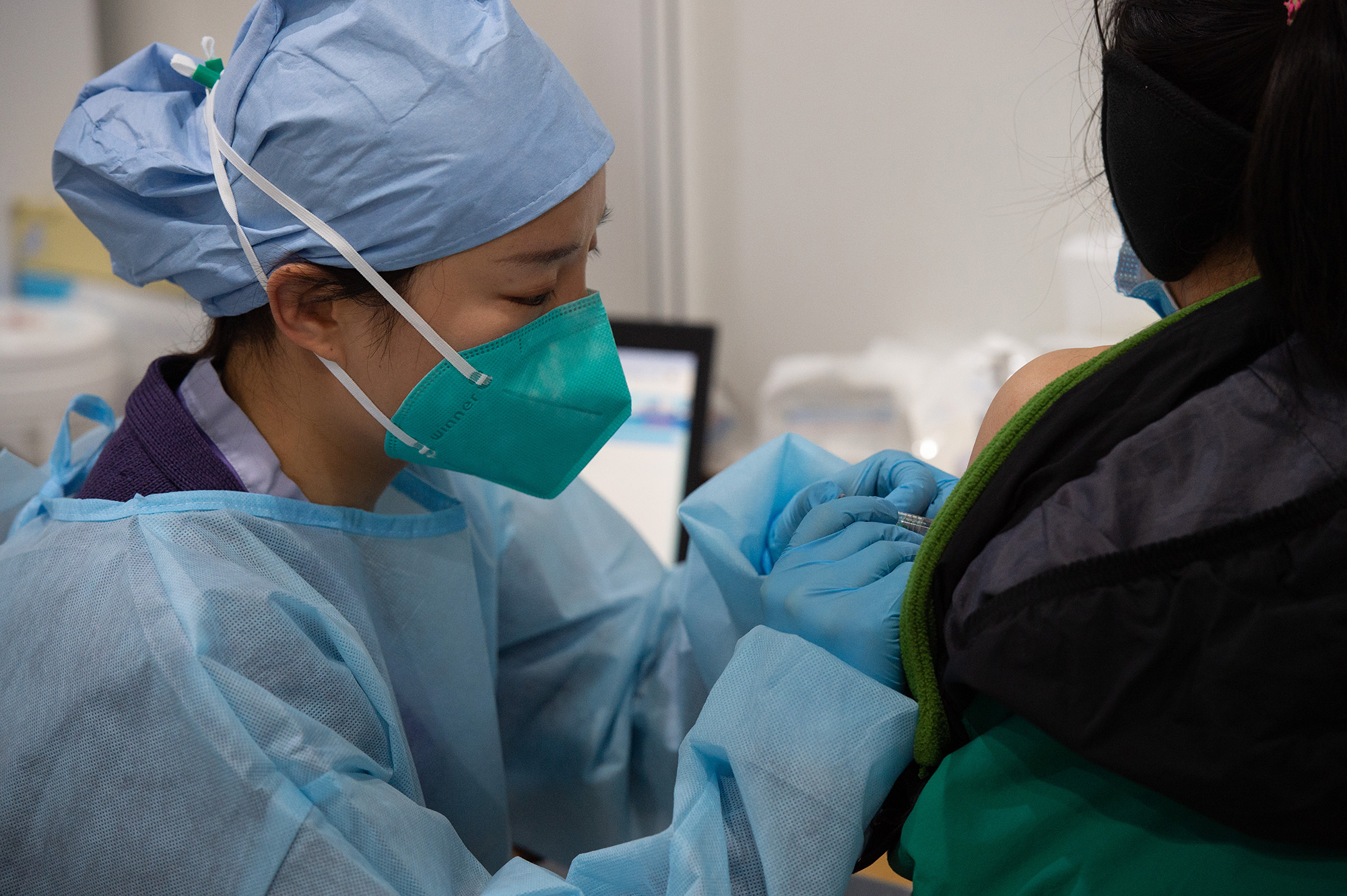 ↑2021年1月2日,在北京市朝陽區(qū)一臨時(shí)接種點(diǎn),醫(yī)護(hù)人員為接種人員注射新冠病毒疫苗。