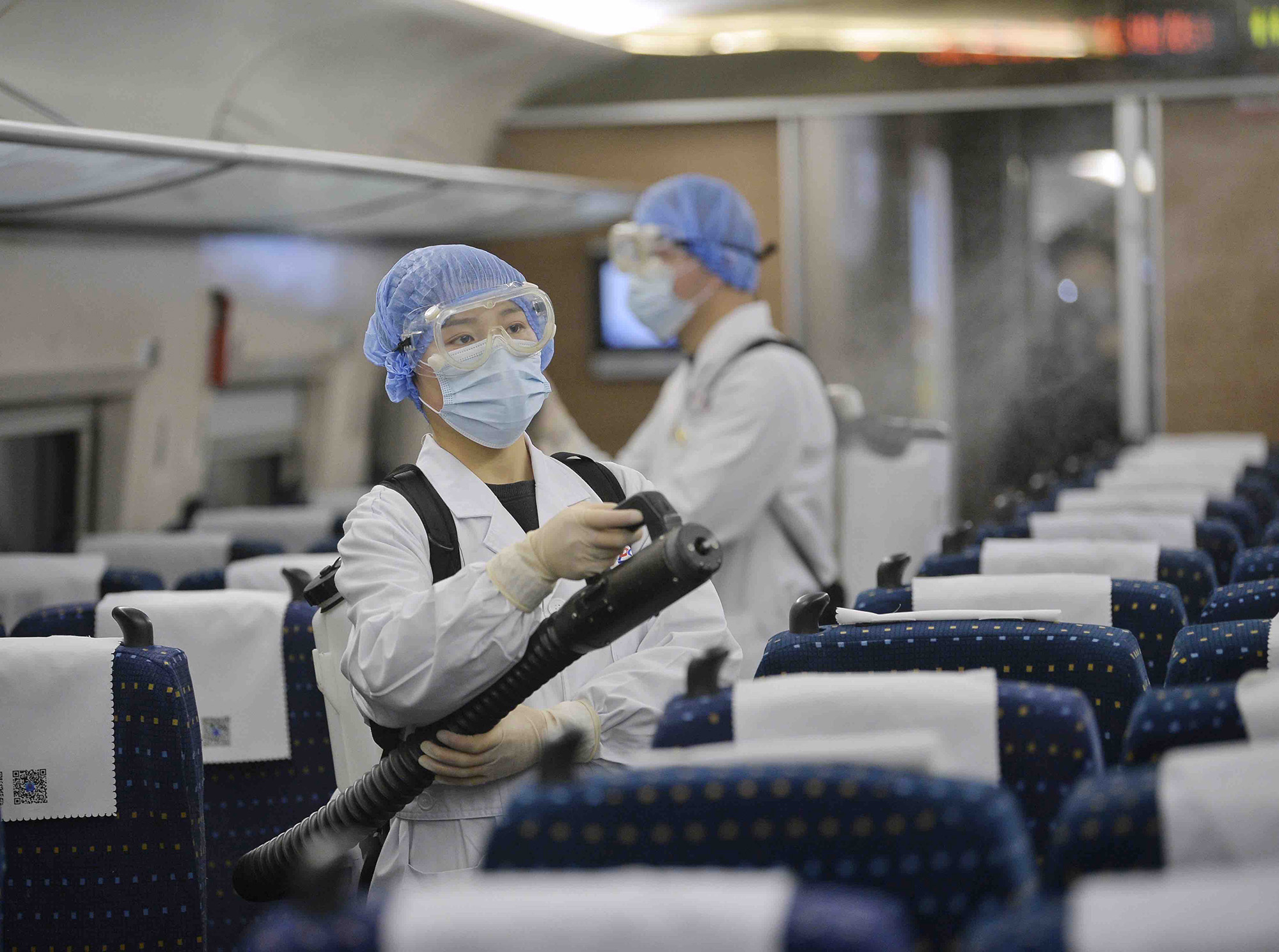 ↑2021年2月2日,中國(guó)鐵路成都局集團(tuán)有限公司成都疾病預(yù)防控制中心消毒監(jiān)測(cè)科的消毒人員在對(duì)列車車廂進(jìn)行消毒。